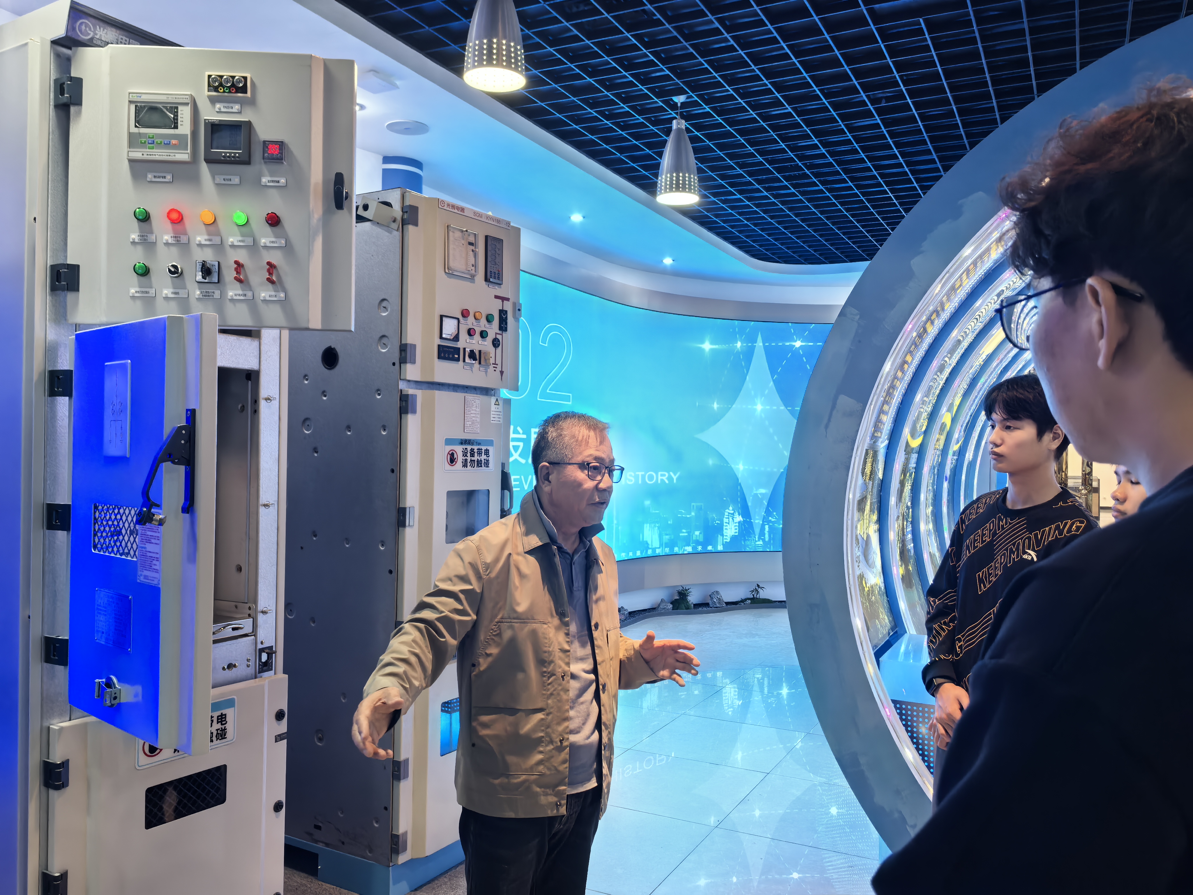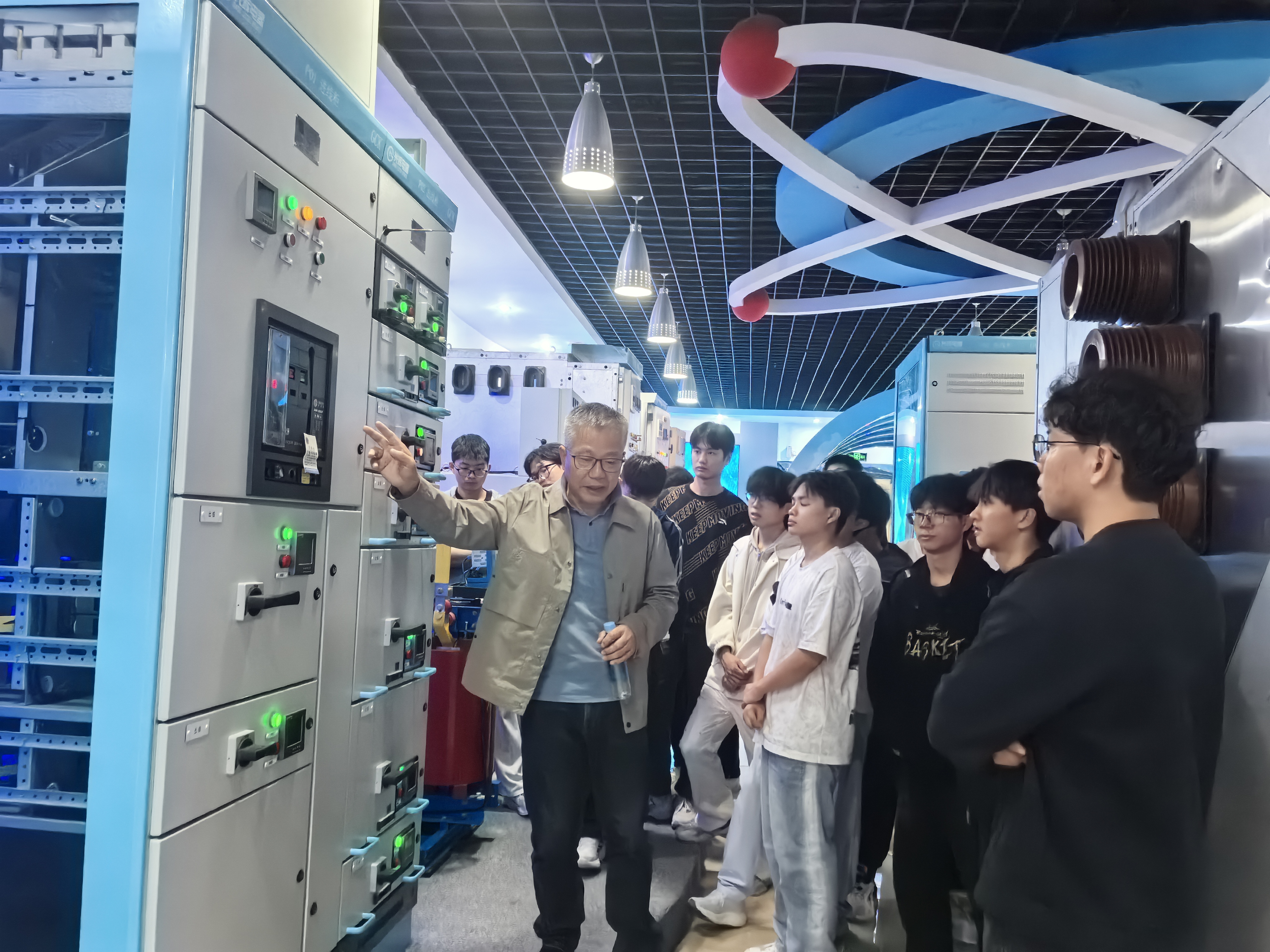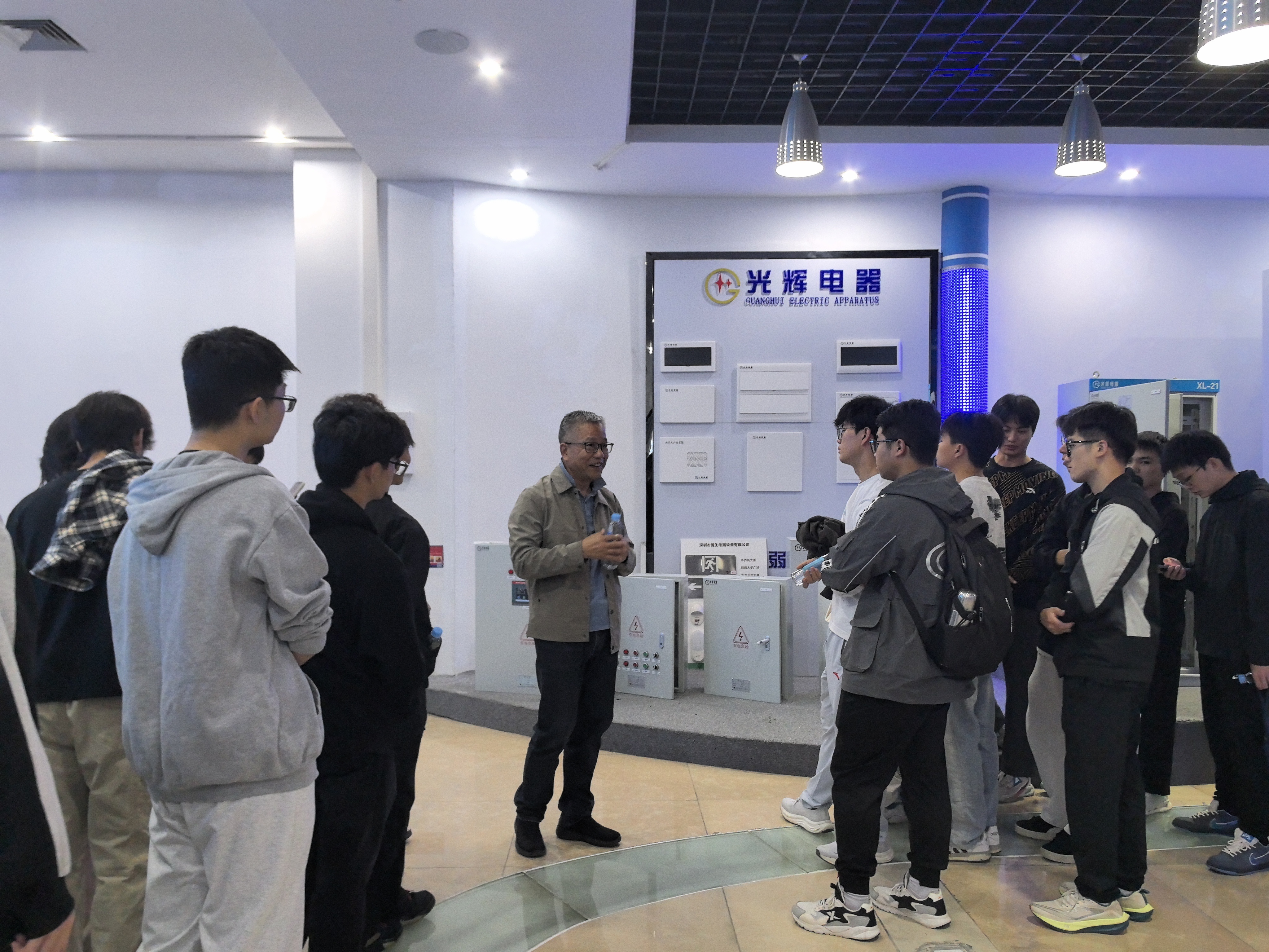 在光辉电器技术总监的带领下,学子们首先参观了智能生产线,观摩了智能制造设备的精准运作,了解了建筑智能控制器从零部件到成品的全流程生产;随后前往智造中心,探究产品的内部构造与工作原理;最后在产品展示厅,技术负责人围绕高压柜、低压柜、配电箱等核心产品,深入讲解了技术参数、安全规范及在建筑供配电系统中的实际应用。同学们认真聆听记录,积极提问,现场学习氛围热烈。